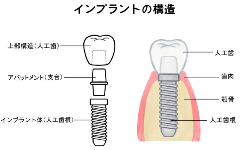 インプラントとは、歯を欠損した場所の歯槽骨に人工の歯根(インプラント体)を埋め込み、その上に人工の歯(上部構造)を装着するものです。インプラント体と上部構造(人工歯)をつなぐ部分は、アバットメント(支台)と呼ばれます。