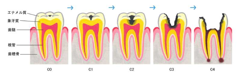 既存障害に該当するのは、過去の事故によるものだけではありません。代表的なのは、う蝕症(虫歯)です。う蝕症は、う蝕第1度(C1)~う蝕第4度(C4)に分類され、C4は歯冠部の大部分を欠損していた歯に該当し、既存障害として認定します。